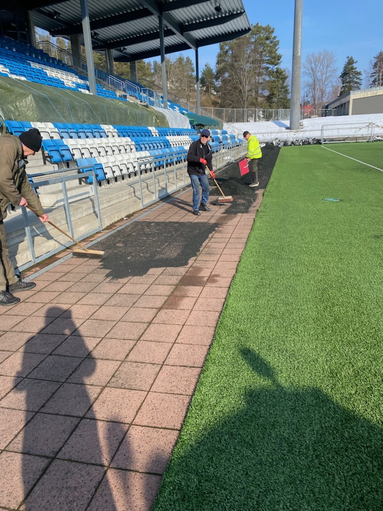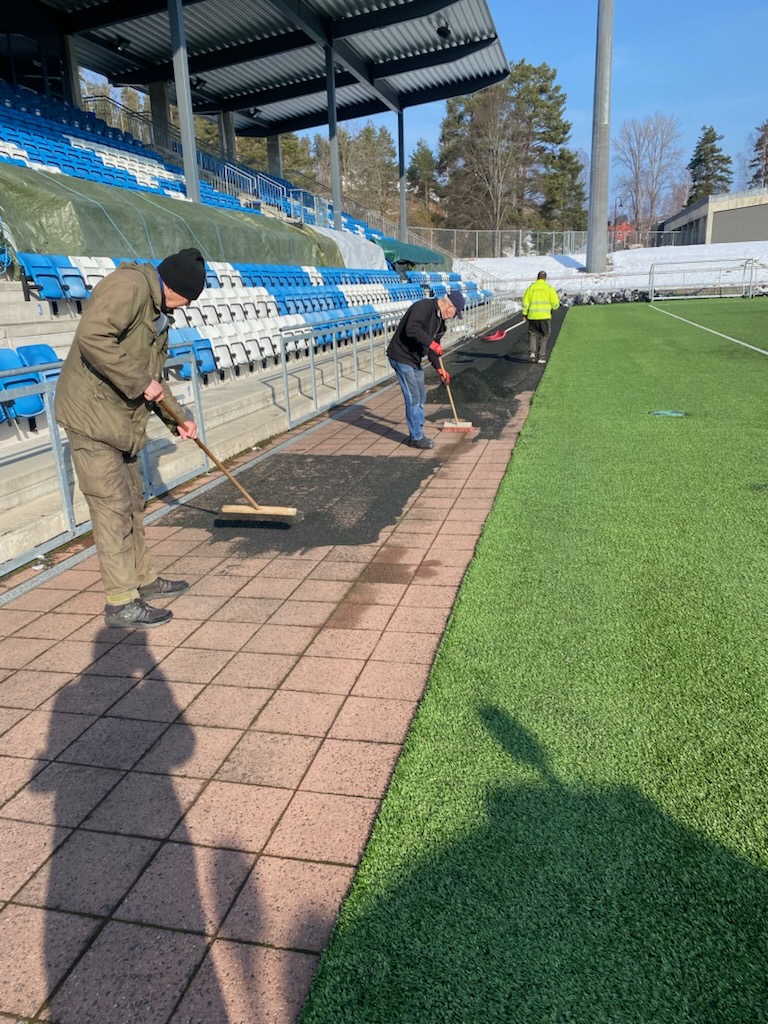 Frivillig innsats rundt banen gjør anlegget klart og sørger for at mest mulig granulat kommer tilbake der det hører hjemme.